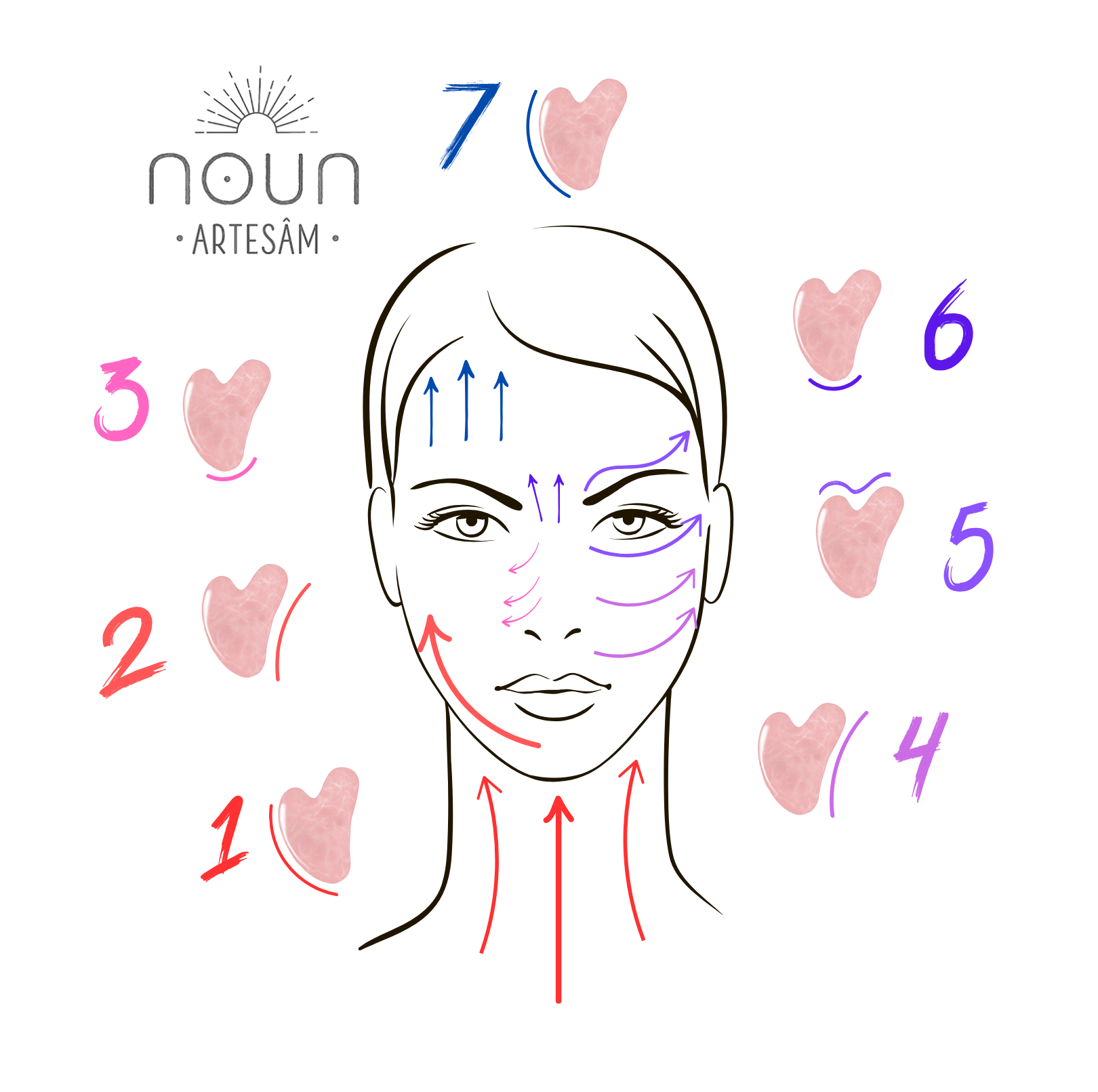 Déroulement de l'automassage : l'image qui suit propose une méthodologie pour l'automassage avec un Gua Sha. C'est une proposition, soyez libre d'utiliser les reliefs de la pierre de la manière qui vous semble la plus appropriée ce jour à votre zone du visage.
