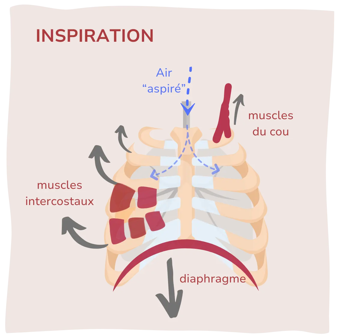 Ces muscles modifient le volume de la cage thoracique, créant un appel d’air vers les poumons. On peut les comparer à un accordéon : lorsque l’instrument s’étire, l’air entre naturellement ; lorsqu’il se resserre, l’air est expulsé.